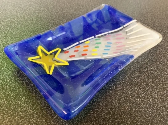 But wait…. it will require one more firing to transform my soap dish from a flat piece of art into its dishy shape. This firing is called a Slump firing. We will cook the glass in the kiln a second time but at a lower temperature to simply soften the glass into a mold that will be placed below. Different glass artworks can require what are called different firing Schedules. It’s just another part of the recipe when you are cooking glass artwork!